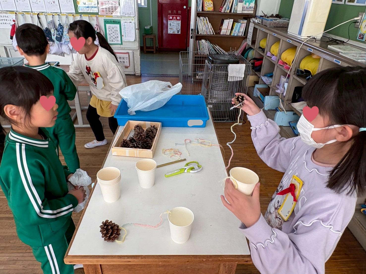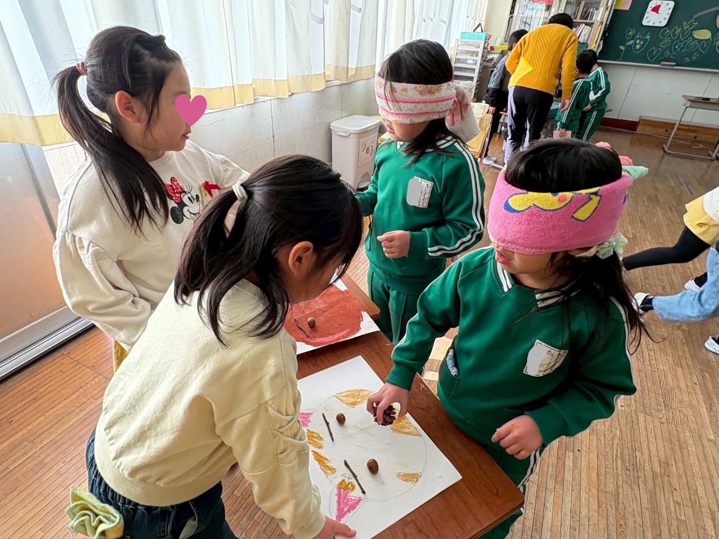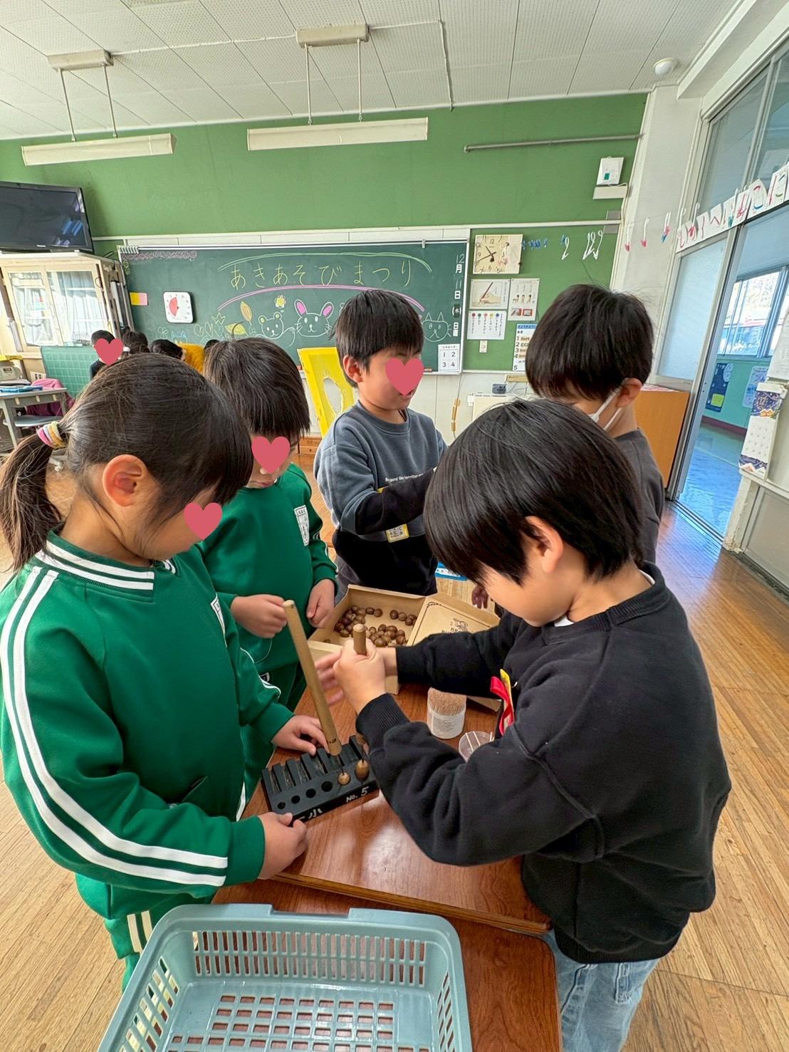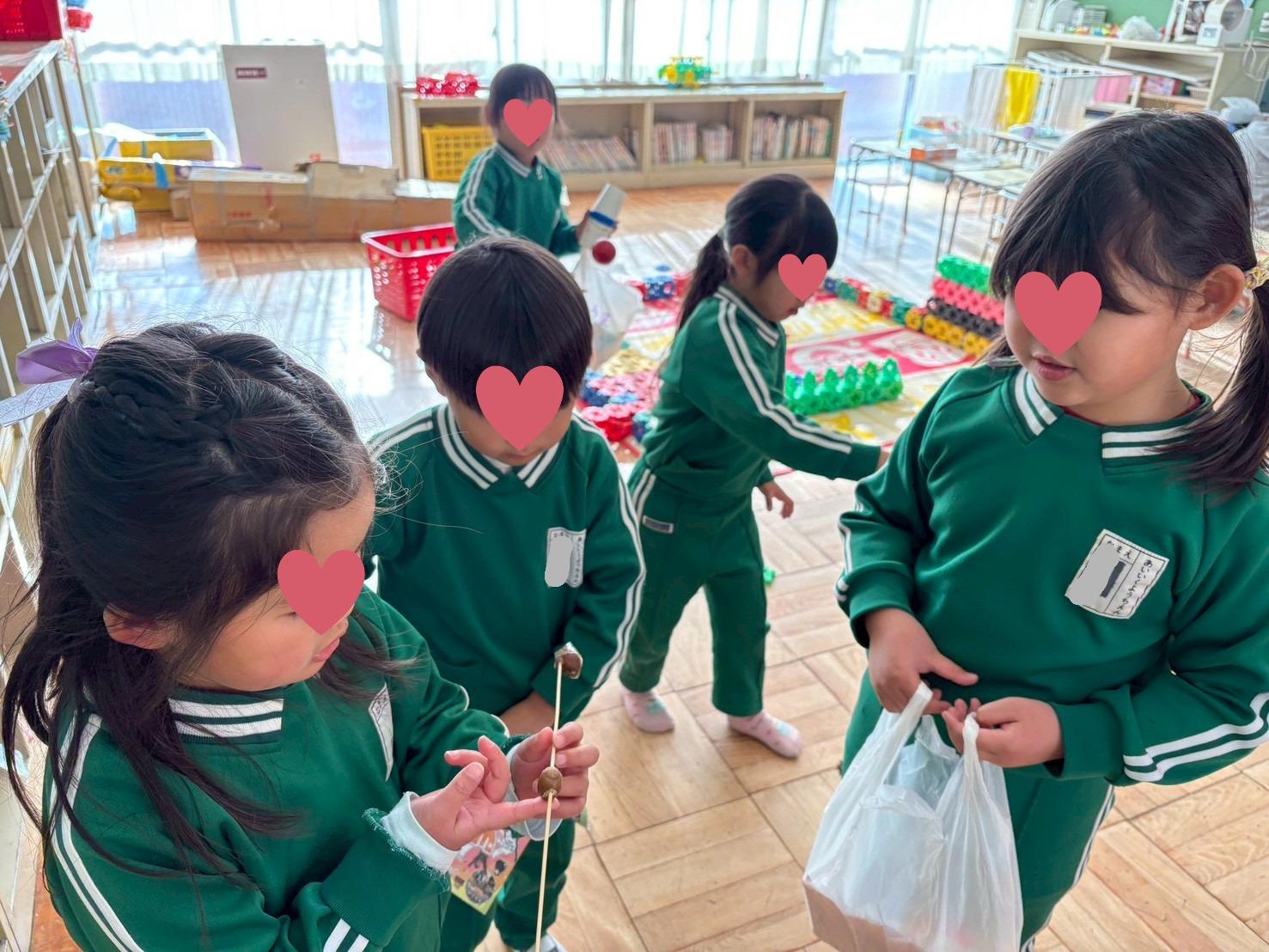 帰園し、早速年下のお友だちに、小学生からいただいた手作りおもちゃの遊び方を教える年長児。