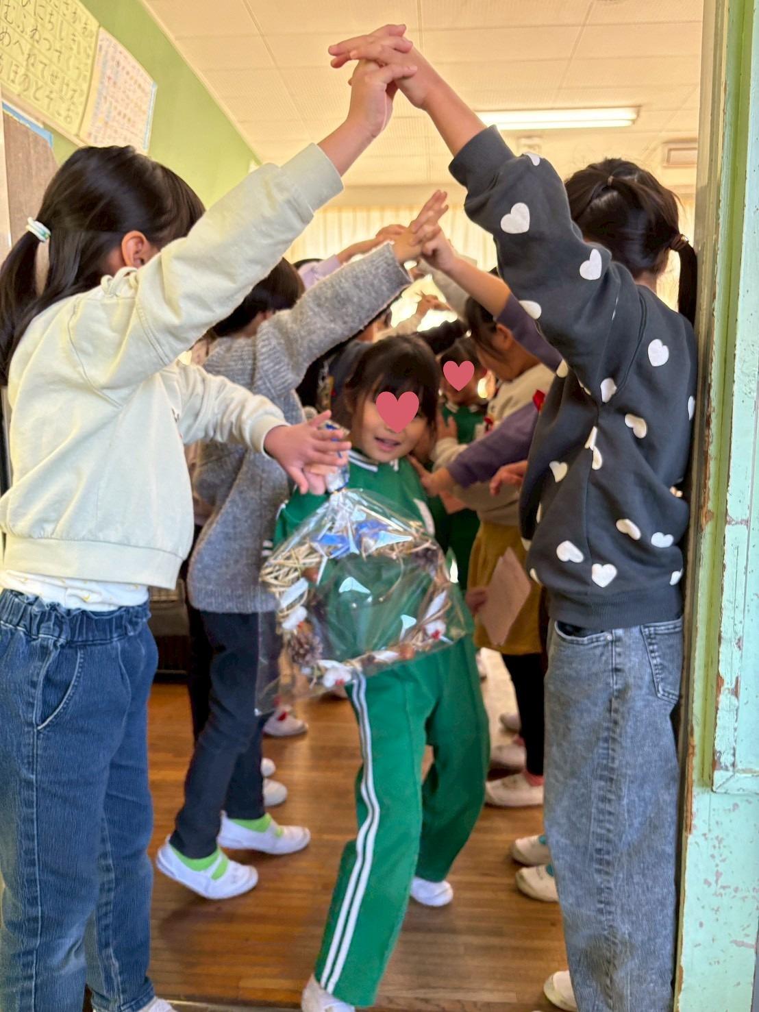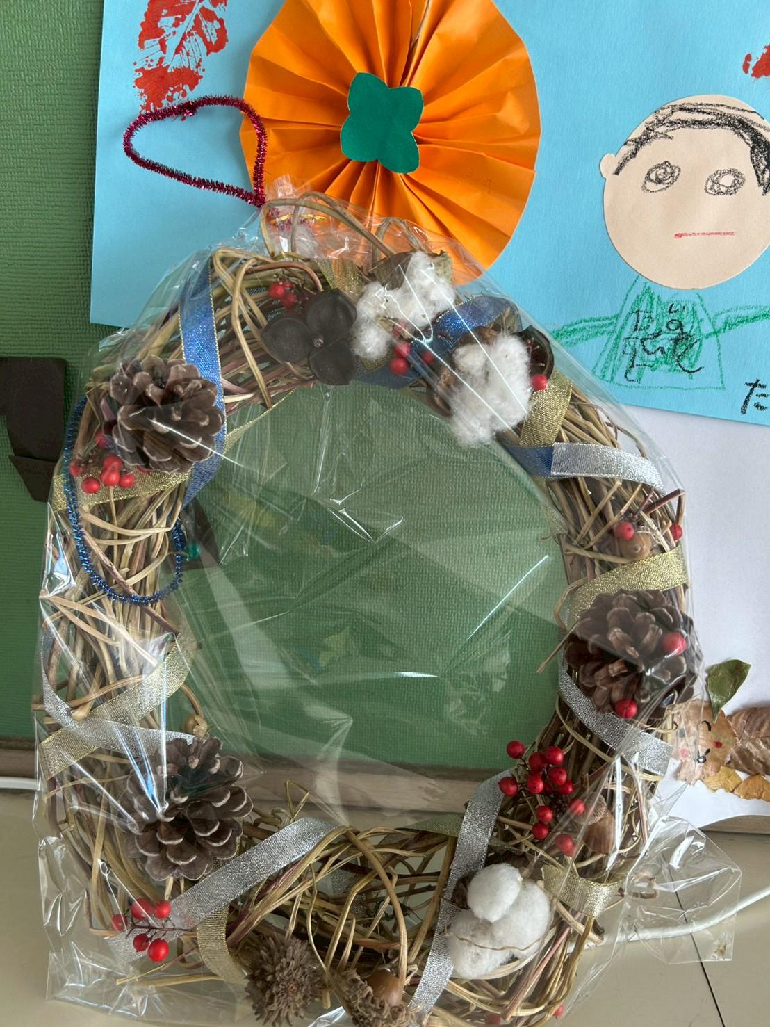 小学生から、年長児1人ひとりに、手作りリースのプレゼントをいただきました。