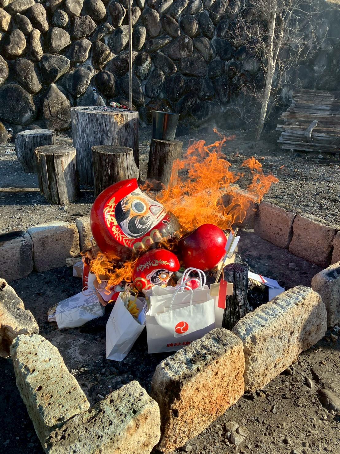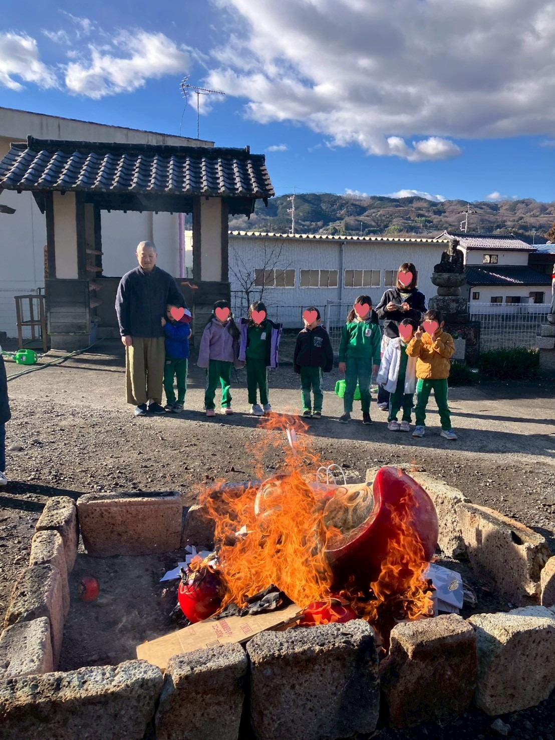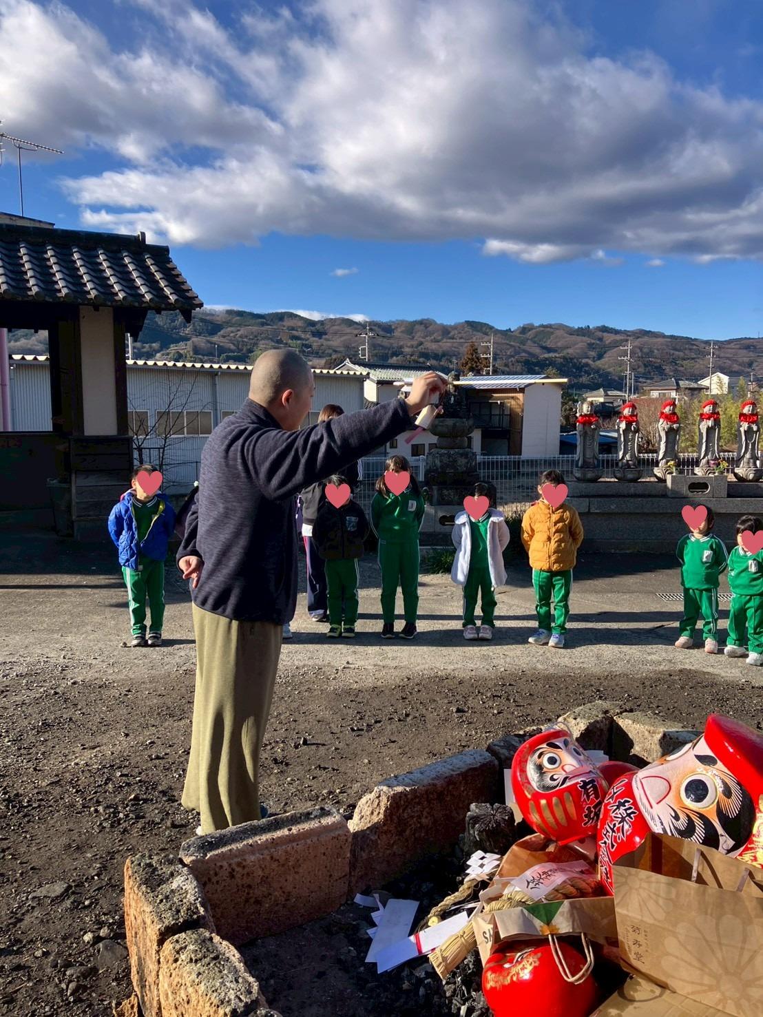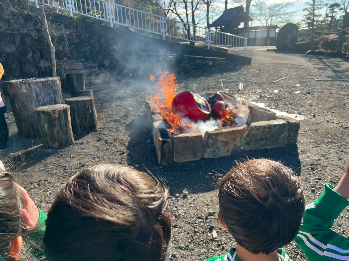 お守り、だるま様、破魔矢、しめ縄飾りなど、副園長先生からそれぞれの意味や由来を教えていただき、感謝の気持ちを込めて、お焚き上げを行いました。