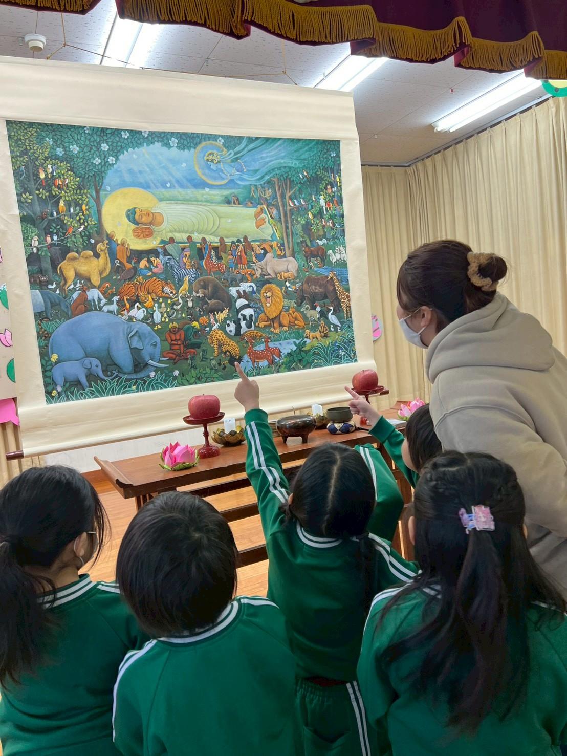 お釈迦様のご入滅を悼む、お弟子さんや菩薩様、動物や昆虫など、たくさんの生きとし生けるものの様子が表現されています。