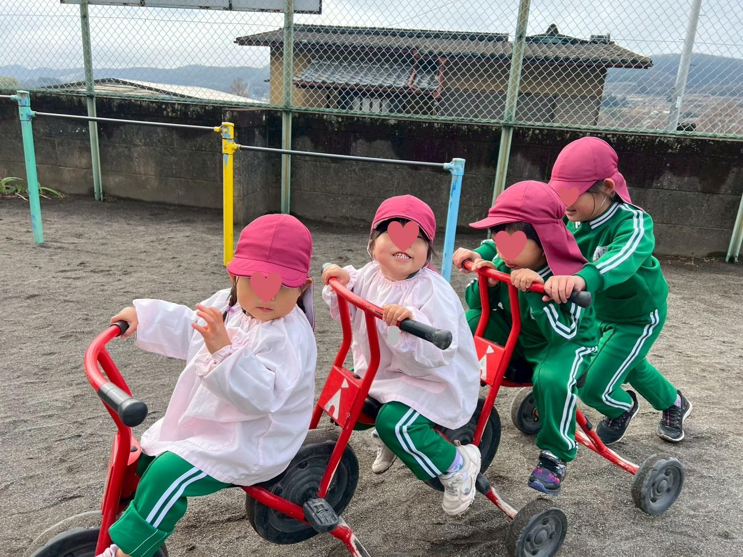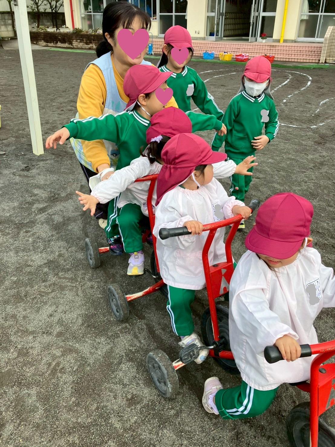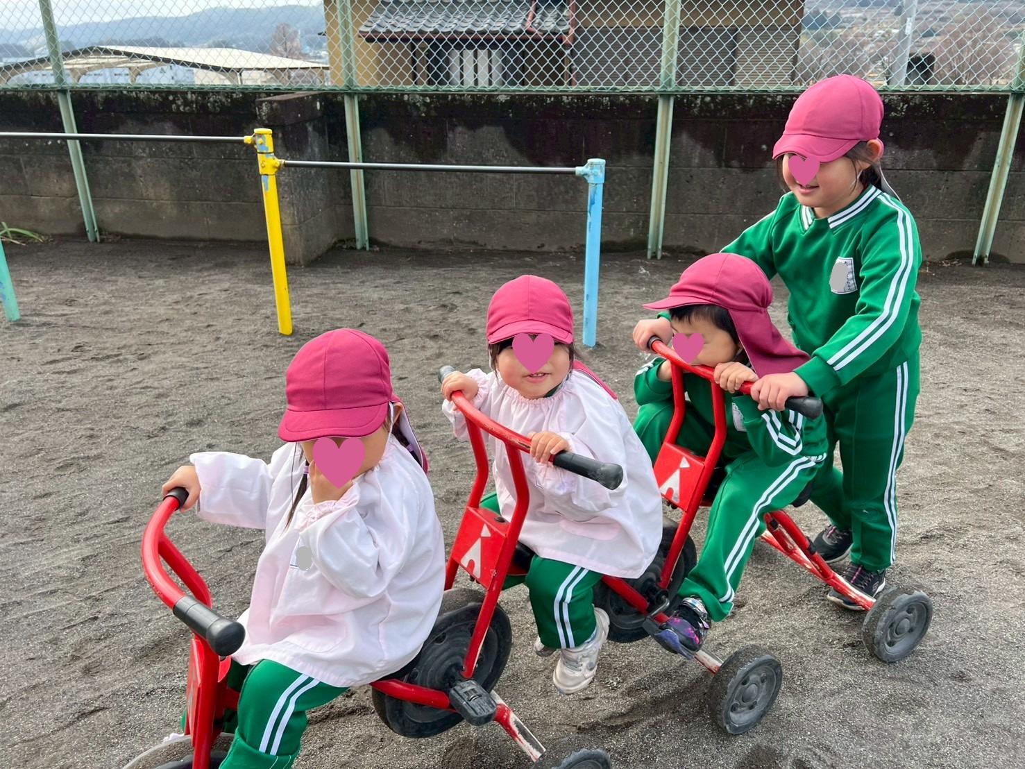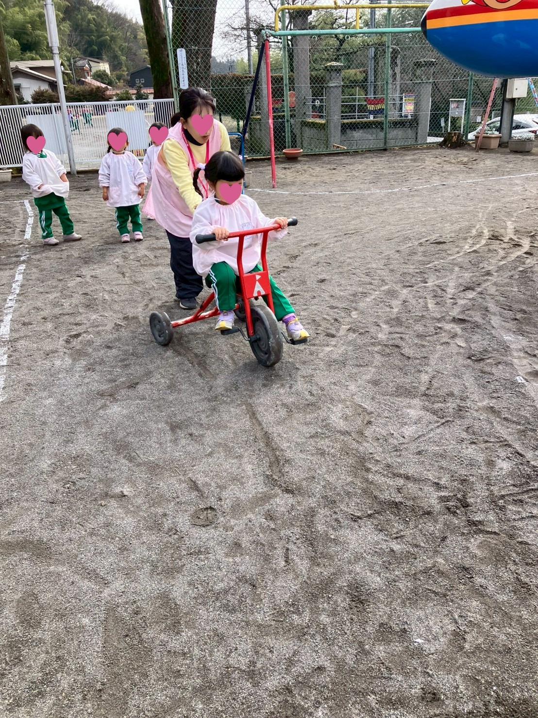 三輪車遊びを楽しむ未満児クラスのお友だち!!